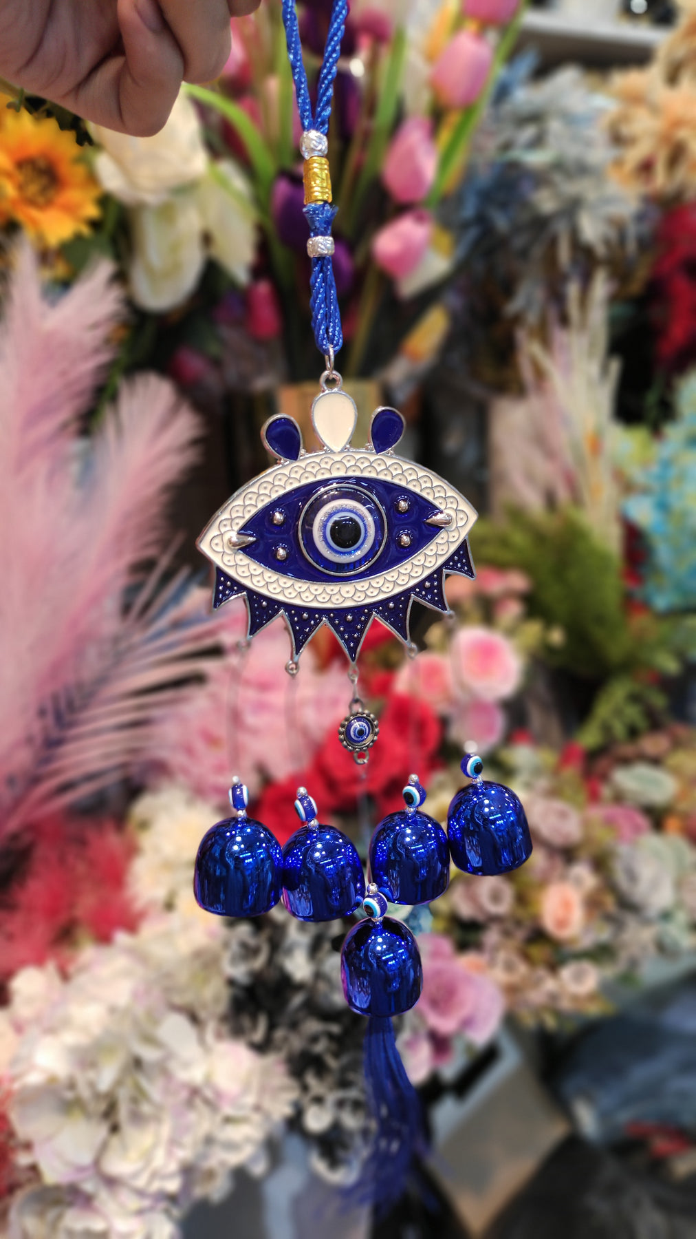 Bring positivity and charm to your home with this beautiful Evil Eye hanging décor. Designed with intricate detailing, it features a central elephant adorned with the iconic evil eye for protection and good luck. Surrounded by multiple evil eye charms, the piece is finished with shiny blue metallic bells and a soft tassel, creating an elegant and vibrant look.